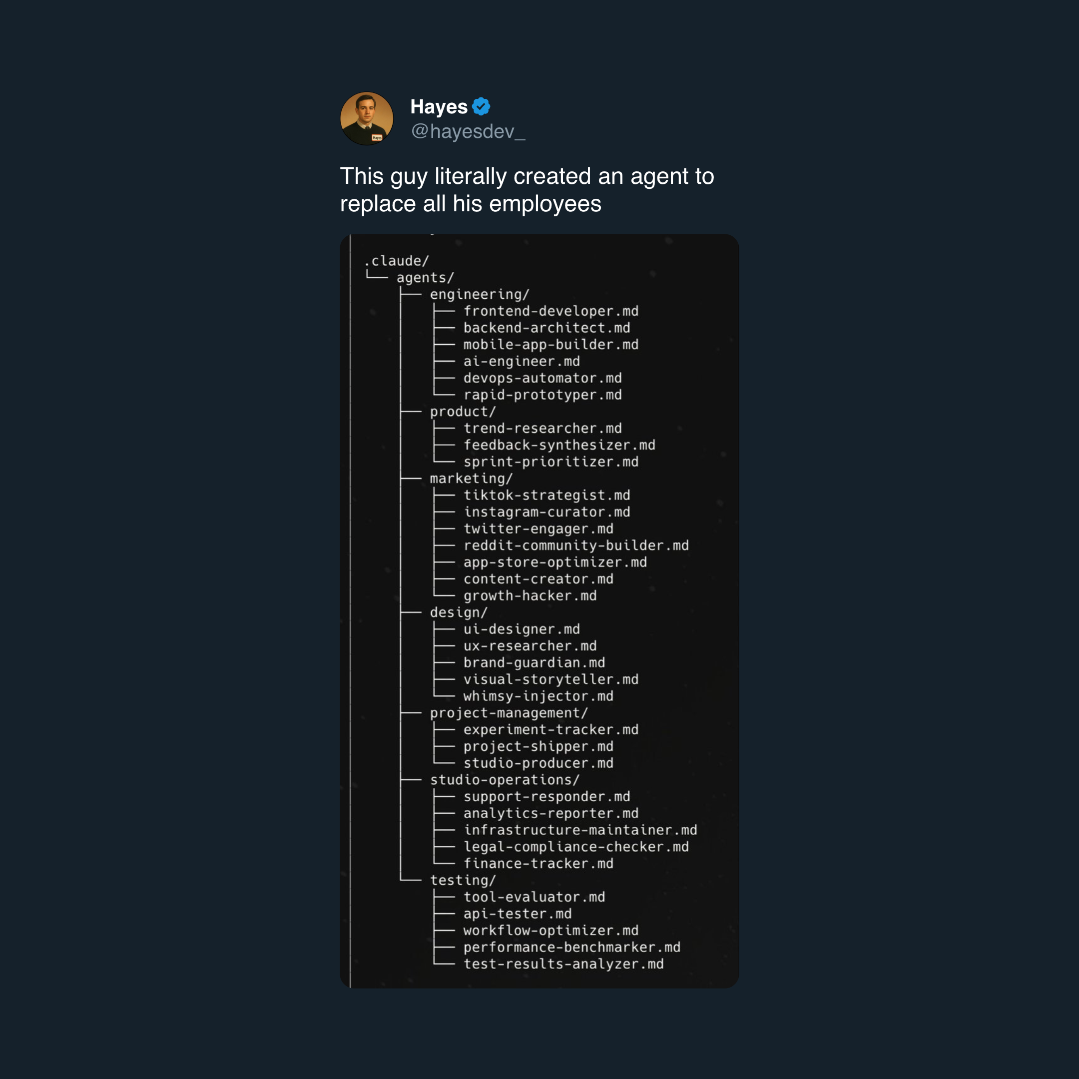 Tweet showing agent hierarchy with frontend-developer, backend-architect, mobile-app-builder, tiktok-strategist